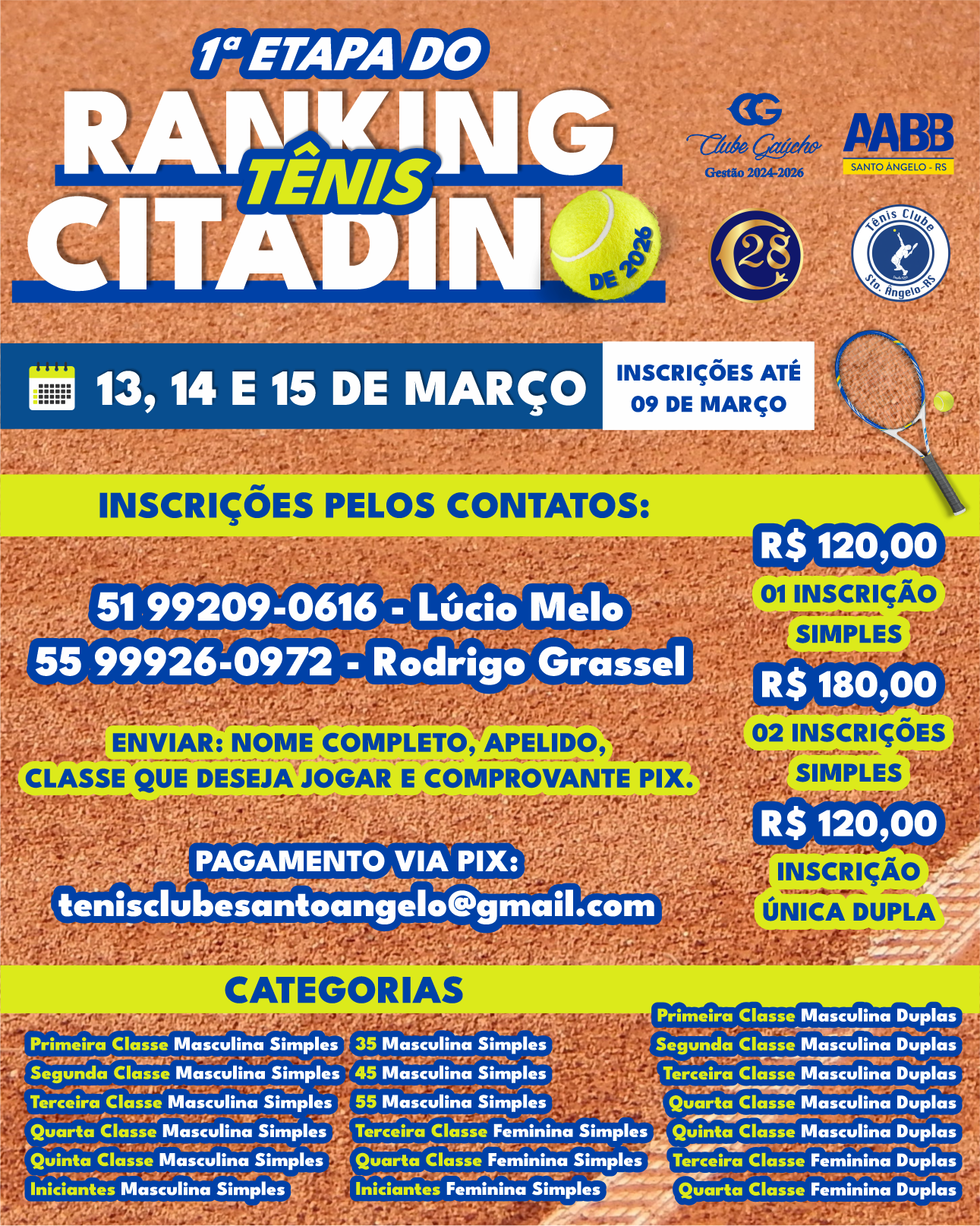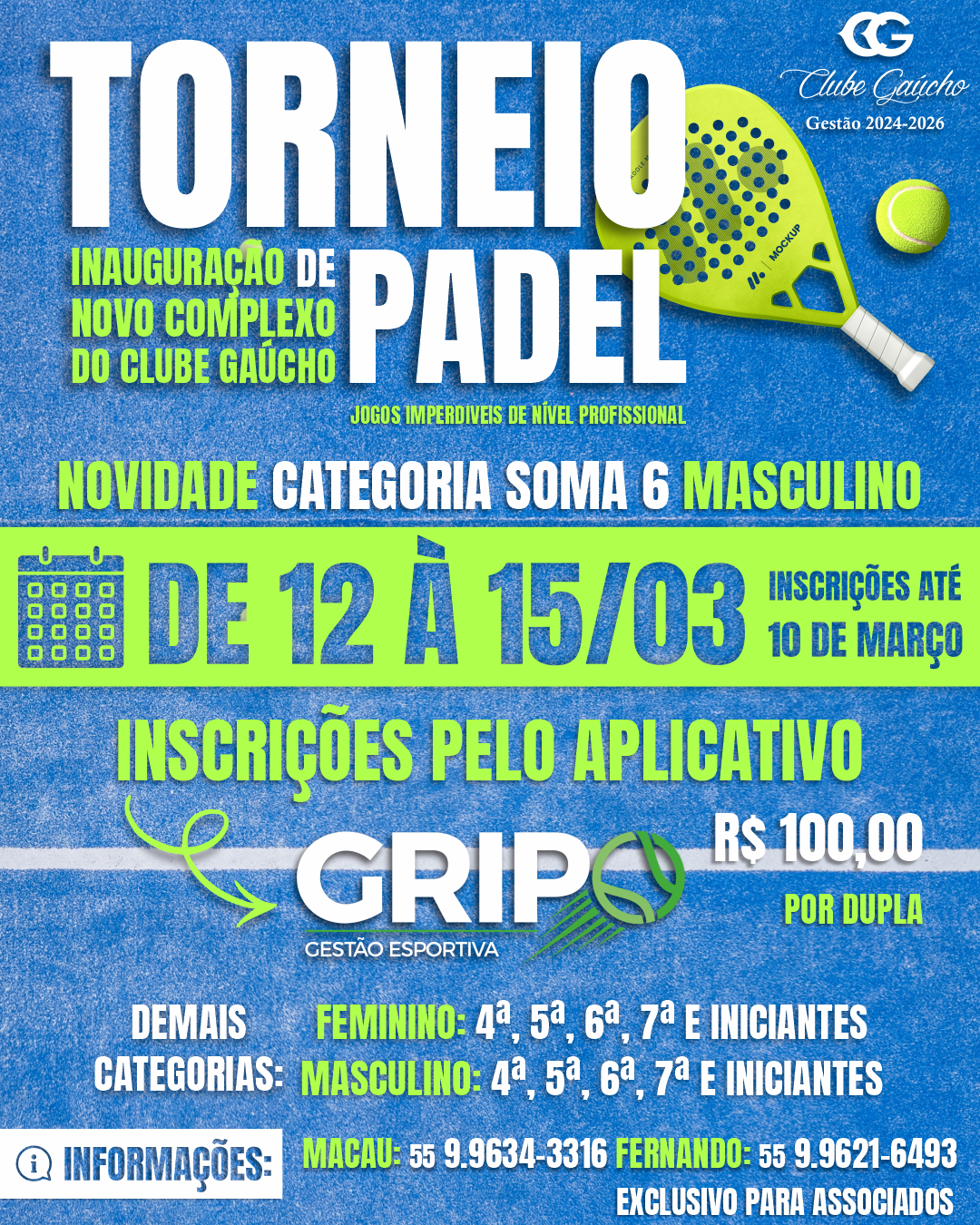 Últimas novidades Torneio de Verão 2026 – Vôlei de Duplas de Areia Ler mais » 1ª Etapa do Ranking Citadino de Tênis de 2026 Ler mais » Torneio de Padel – Inauguração novo Complexo de Padel Ler mais » Ver mais Associe-se no Clube Gaúcho Se Você Tem Interesse Em Ser Um Associado Do Clube Gaúcho, Preencha Abaixo Com Seus Dados Que Entraremos Em Contato Para Conversarmos Sobre Valores E Possíveis Dúvidas, Será Um Prazer Conversar Com Você! Nome E-mail Telefone Solicitar contato Parceiros do Clube Gaúcho Anterior Próximo